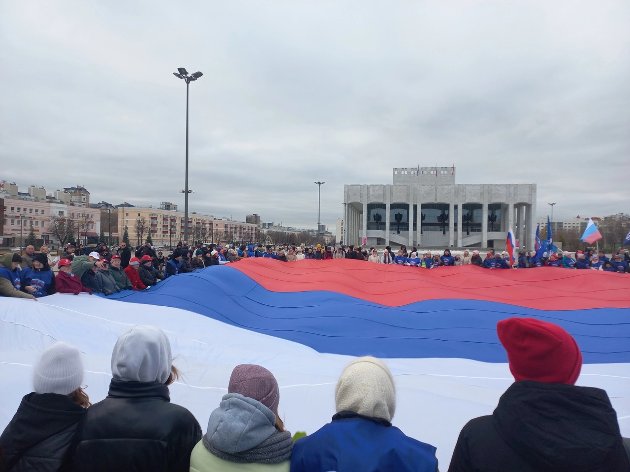 Отцы и дети Перми приняли участие в праздничном мероприятии, посвященном дню народного единства В День народного единства в центре Перми состоялся флешмоб «Мы едины, мы Россия!». Волонтёры развернули большой флаг России размером 30х60 метров.