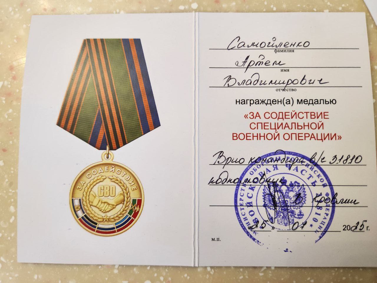 Руководителю отделения в Кавминводах вручили медаль «за содействие Специальной Военной Операции» Председатель местного отделения Всероссийского общественного движения «Отцы России» В Кавказских Минеральных Водах, член Правления движения Артем Самойленко был удостоен памятной медали «За содействие специальной военной операции».