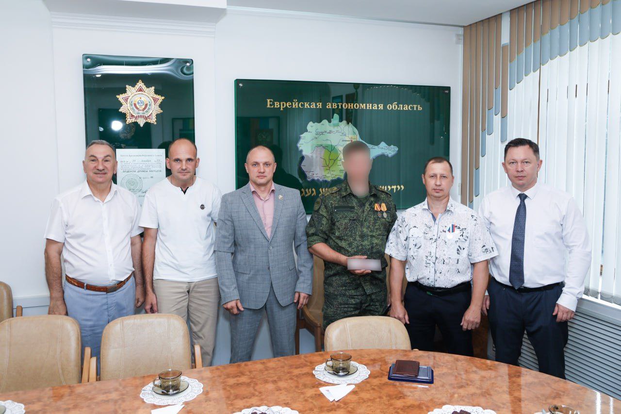 Медали «Отец солдата» вручили в Еврейской автономной области На днях в здании Законодательного Собрания Еврейской автономной области состоялась встреча Председателя ЗС Романа Бойко с участниками специальной военной операции, уроженцами Октябрьского района автономии Владимиром и Дмитрием Грибковыми и Денисом Чупровым.