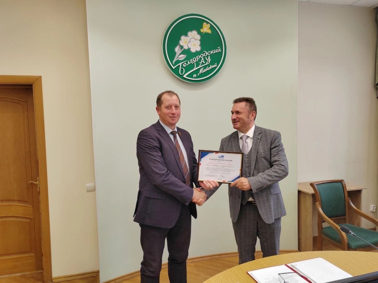 Председатель правления поблагодарил ректора Белгородского ГАУ за поддержку проектов Отцовского движения На днях состоялось заседание ректората Белгородского государственного аграрного университета, на котором председатель отделения ВОД «Отцы России» в регионе Александр Косов вручил благодарственное письмо от Председателя Правления движения Андрея Юрьевича Коченова ректору университета Станиславу Николаевичу Алейнику.