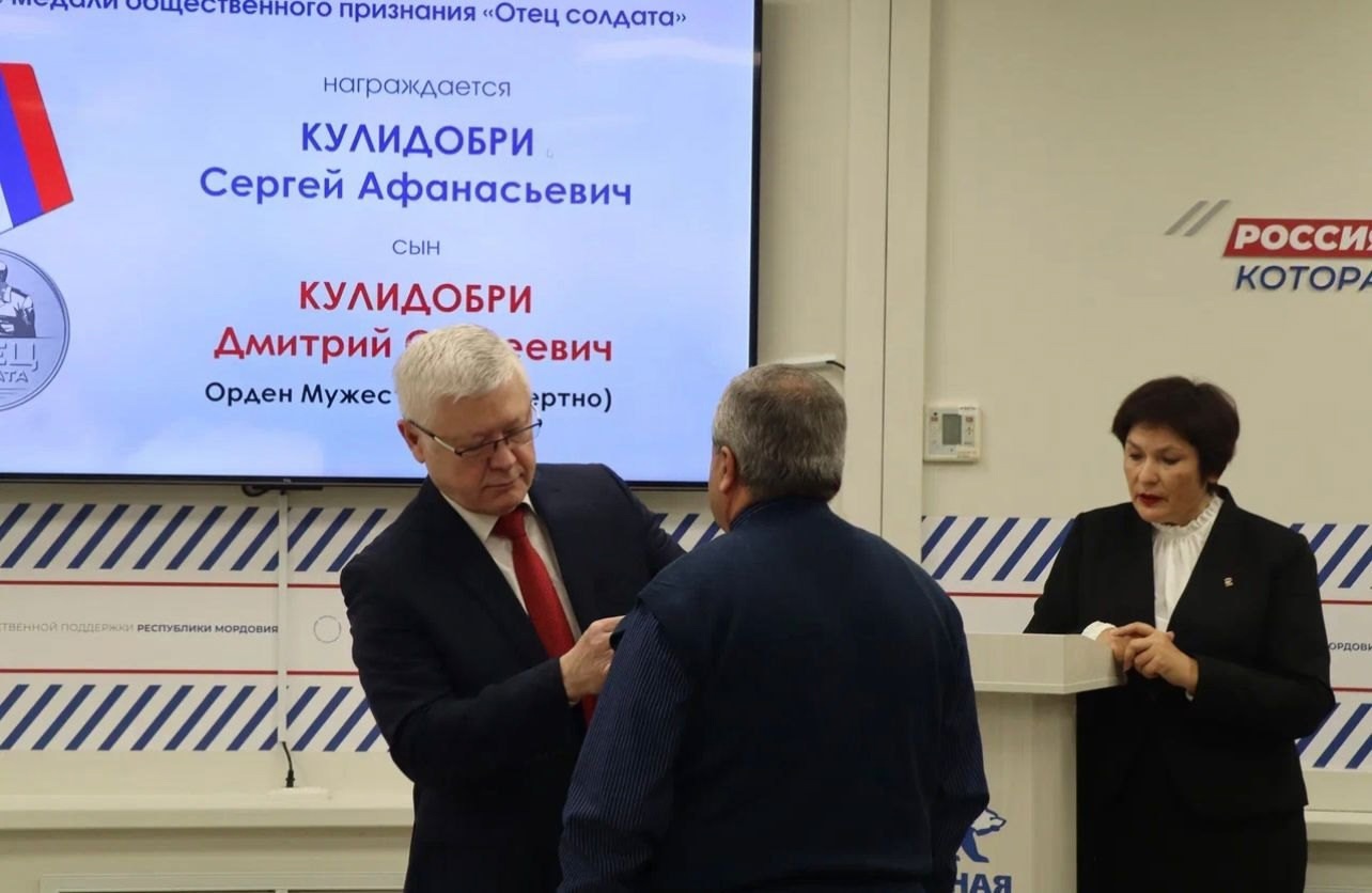 Дань уважения родителям. В Мордовии вручили медаль «Отец солдата» Сегодня в Штабе поддержки партии «Единая Россия» состоялась церемония вручения награды общественного признания «Отец солдата». Медали был удостоен Сергей Кулидобри. Его сын, кавалер ордена Мужества, героически погиб в зоне СВО.