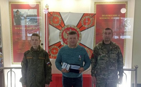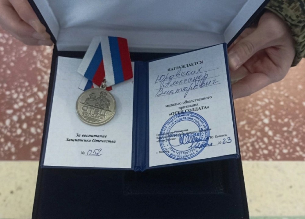 От имени Всероссийского общественного движения «Отцы России» и командования воинской части Александру Викторовичу вручили медаль общественного признания «Отец солдата» за воспитание защитника и личный пример.
