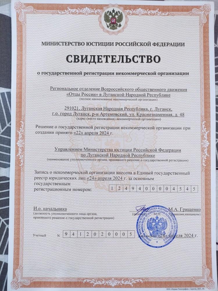 Член правления движения и Председатель отделения ВОД «Отцы России» в Луганской Народной Республике Иван Санаев получил документы из Министерства юстиции о регистрации представительства.