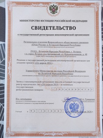 Член правления движения и Председатель отделения ВОД «Отцы России» в Луганской Народной Республике Иван Санаев получил документы из Министерства юстиции о регистрации представительства. Это первое отделение на освобождённых территориях, которое получило официальный статус.