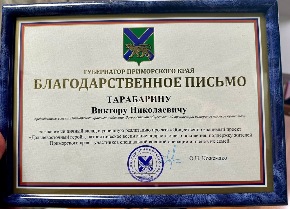Председатель отделения ВОД «Отцы России» в Приморском крае и депутат Думы города Владивостока Виктор Тарабарин получил Благодарственное письмо губернатора региона Олега Кожемяко.