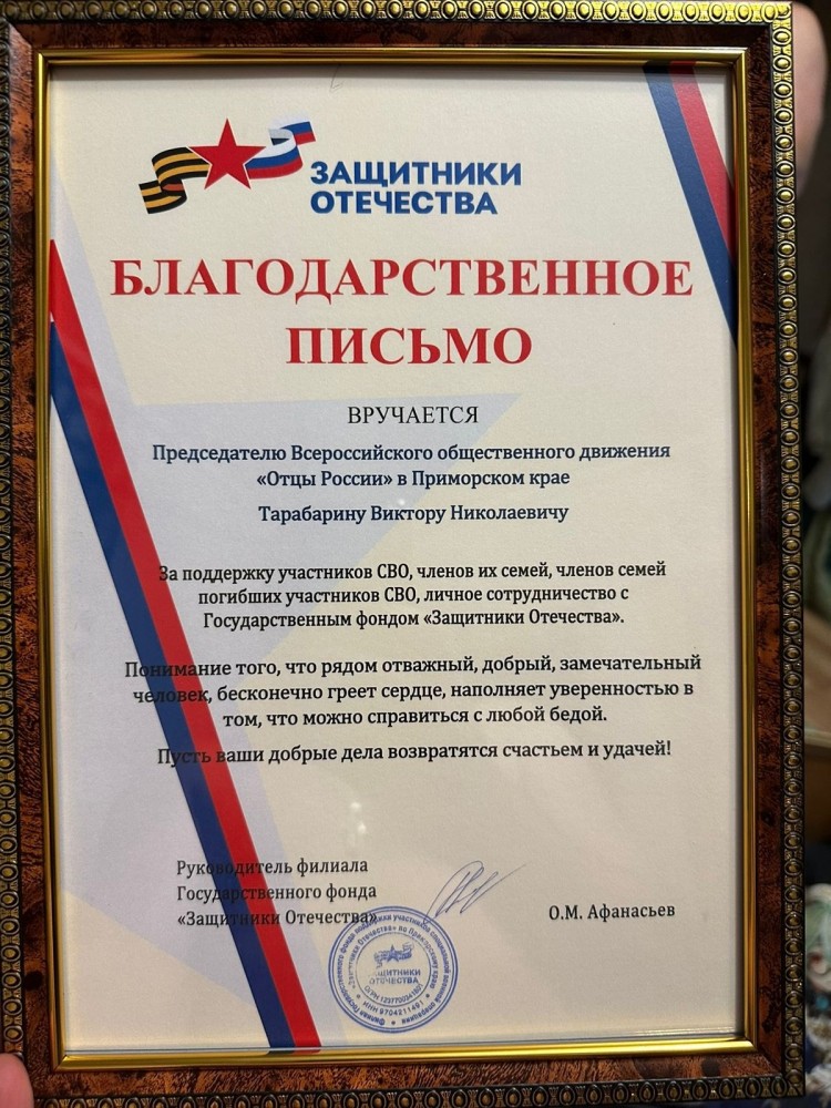 Председатель ВОД «Отцы России» в Приморском крае, депутат Думы города Владивостока Виктор Тарабарин посетил торжественное собрание, посвященное годовщине создания Государственного фонда поддержки участников СВО «Защитники Отечества».