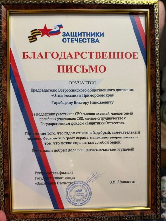 Руководитель филиала фонда «Защитники Отечества» Олег Афанасьев вручил Виктору Николаевичу Благодарственное письмо и поблагодарил за поддержку участников СВО, членов их семей, членов семей погибших участников СВО, личное сотрудничество с фондом.
