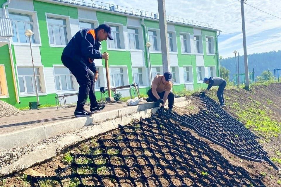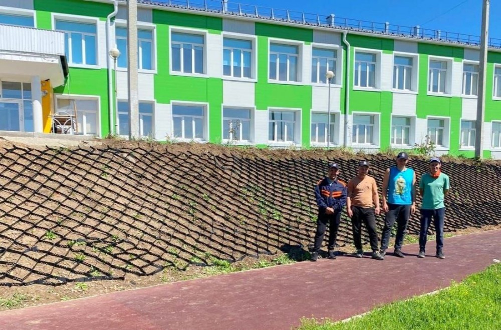 Члены Совета отцов Иркутского района смонтировали георешётку на земельном склоне стадиона Карлукской школы. Теперь земля не будет осыпаться на беговые дорожки, а на на самом склоне вскоре посадят цветы и кустарники.