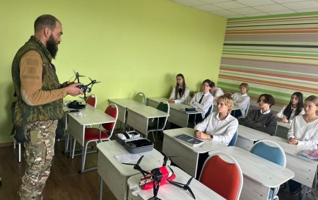 Особый интерес у школьников вызвали беспилотные летательные аппараты. Виктор Тарарбарин и участники военно-патриотического клуба «Де-Фриз» рассказали о возможностях применения ударных и разведывательных беспилотников. Мальчишки с интересом слушали гостей, задавали разные вопросы и показывали свои навыки по управлению дронами.