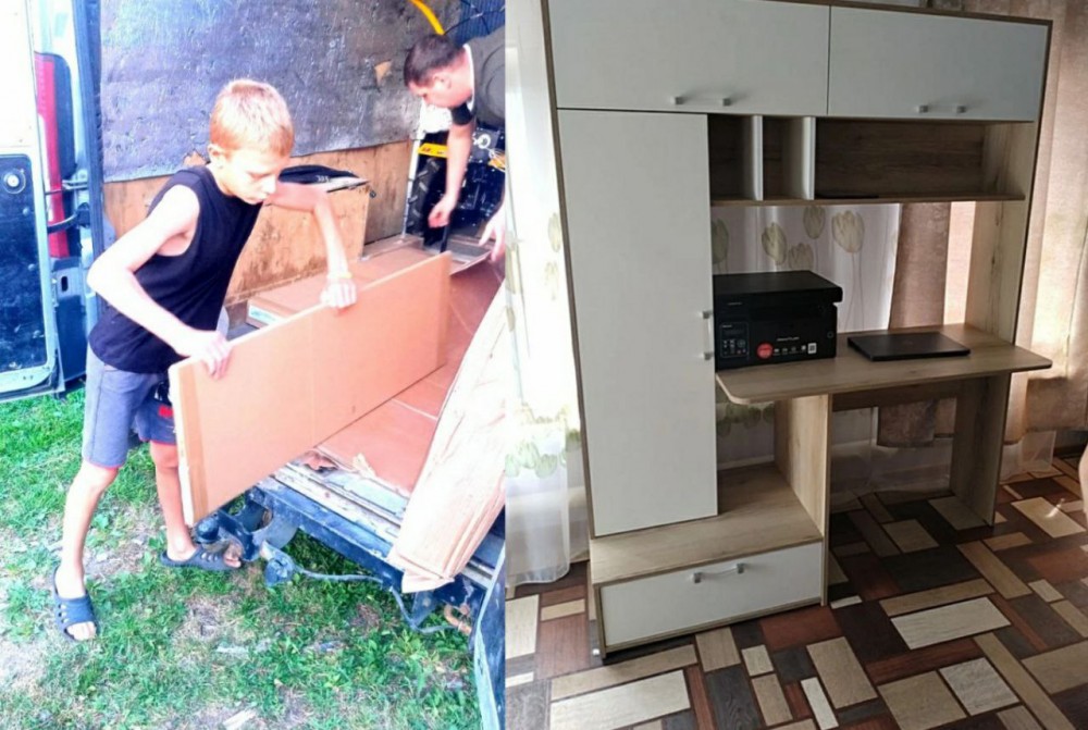 Ребятам привезли и собрали удобный компьютерный стол с местом для хранения учебников и школьных принадлежностей.