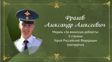 В должности командира радиотехнической батареи зенитного ракетного дивизиона, гвардии капитан Александр Фролов проявил исключительное мужество. Он погиб в зоне СВО в ноябре 2023 года, а 8 апреля 2024 года ему было присвоено звание Героя Российской Федерации.