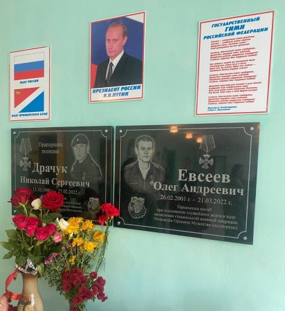 Вчера в школе N18 села Реттиховка Черниговского района Приморского края состоялось открытие мемориальных досок Николаю Сергеевичу Драчук и Олегу Андреевичу Евсееву. Воины погибли при исполнении служебных обязанностей в специальной военной операции.