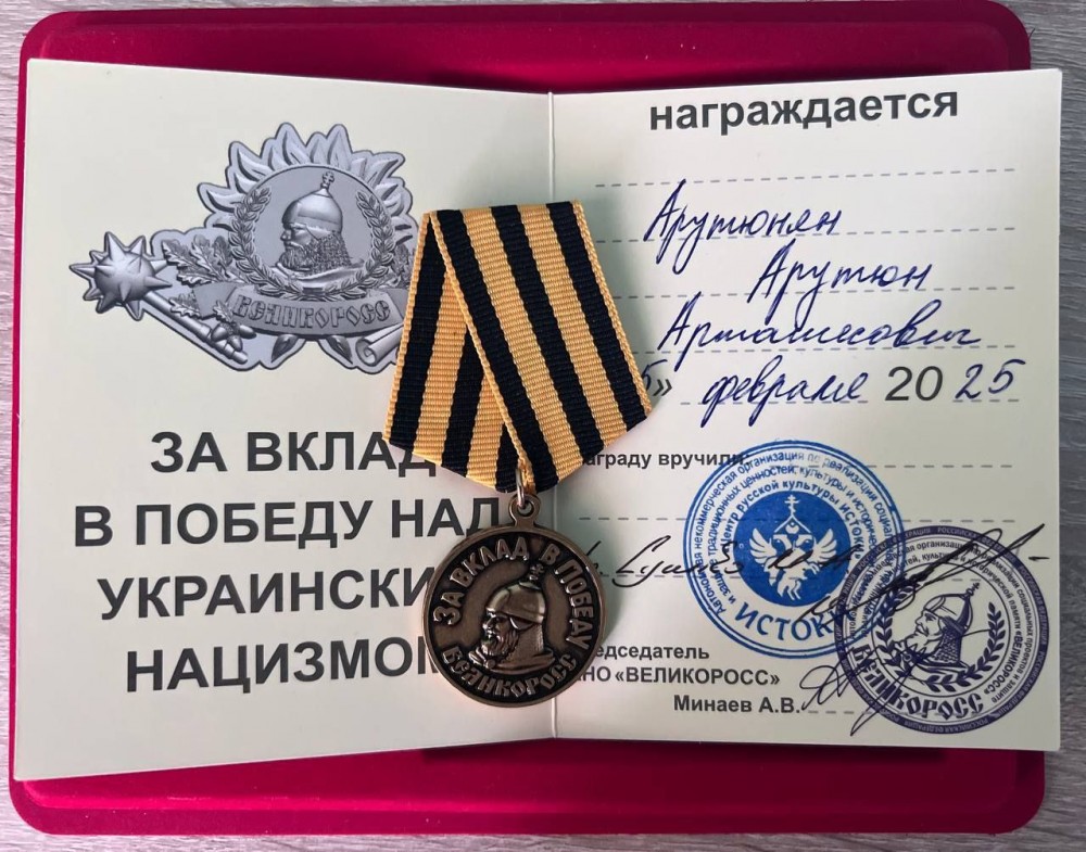 Заместитель Председателя отделения Всероссийского общественного движения «Отцы России» в Пермском крае Арутюн Арутюнян получил медаль «За вклад в победу над украинским нацизмом», учрежденную АНО «Великоросс». Специальные награды и знаки отличия получили бойцы СВО и волонтёрские группы.