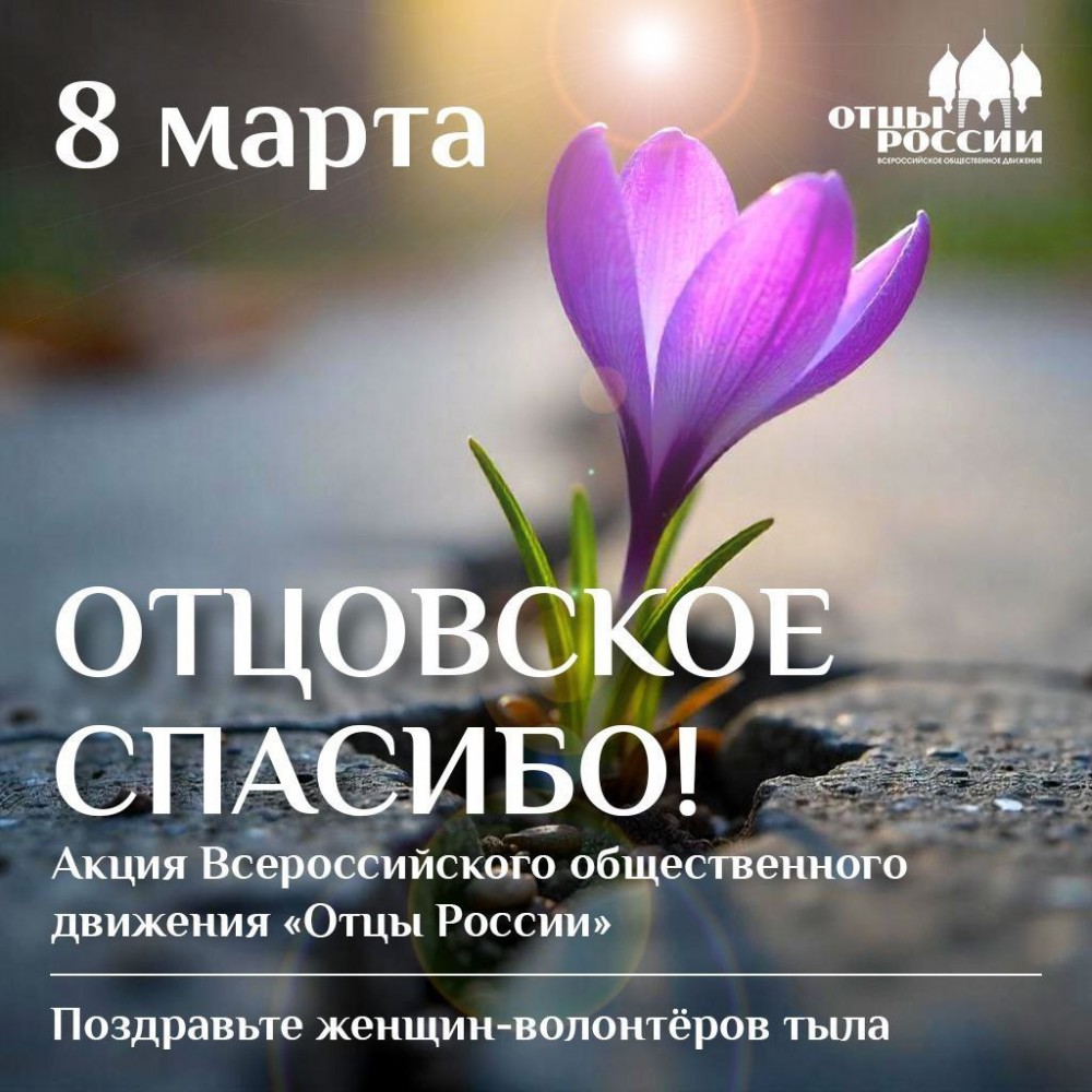 В преддверии 8 марта Всероссийское общественное движение «Отцы России» проводит добрую акцию «Отцовское спасибо». Активисты и лидеры движения со всей страны поздравят женщин-волонтёров, помогающих фронту.