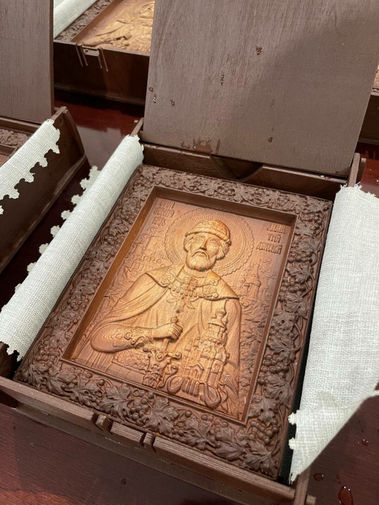 Деревянный образ святого князя, собирателя русских земель, супруга и многодетного отца выполнен в технике барельеф. Такой же иконой Патриарх Московский и всея Руси Кирилл благословил «Отцов России» на встрече с лидерами движения 16 октября прошлого года.