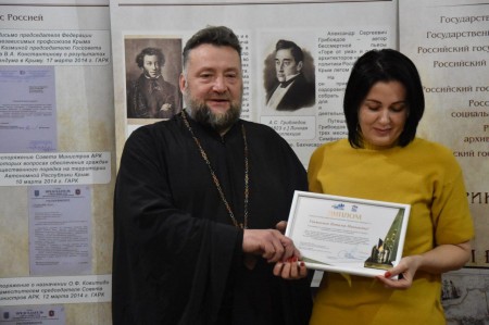Отец Георгий на открытии выставки вручил дипломы премии общественного признания «Окопная свеча», учрежденной Всероссийским общественным движением «Отцы России». Дипломы получили активисты волонтерского движения города Саки Наталья Волкова, Наталья Паралюш, Наталья Тютерева, Татьяна Сибирцева. Они — крепкий тыл для бойцов СВО.