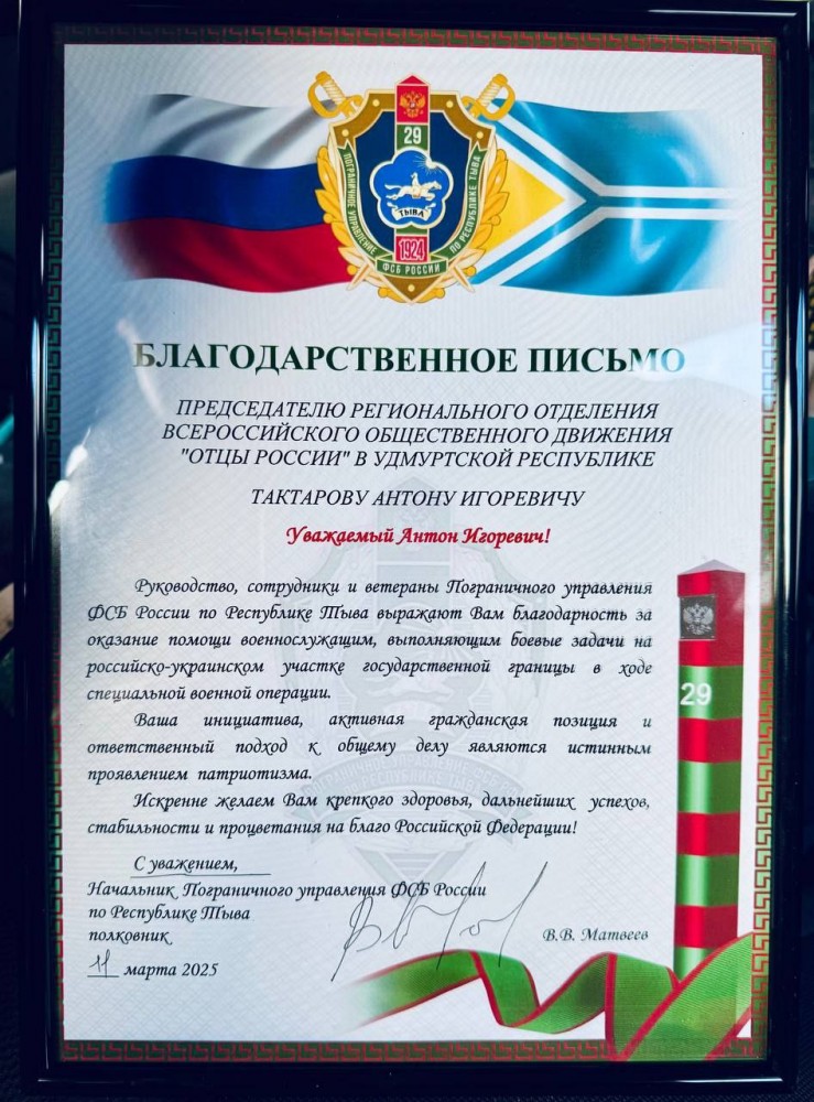 Председатель отделения Всероссийского общественного движения «Отцы России» в Республике Удмуртии Антон Тактаров получил благодарность от руководства, сотрудников и ветеранов Пограничного управления ФСБ России по Республике Тыва за оказание помощи военнослужащим в зоне СВО.