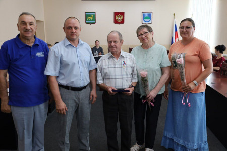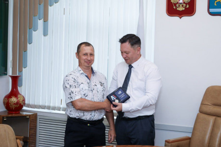 В зале заседаний Роман Бойко и председатель городской Думы Биробиджана, руководитель Ассоциации ветеранов СВО в ЕАО Сергей Радецкий вручили Владимиру Грибкову медаль общественного признания «Отец солдата» за достойное воспитание сына Дмитрия, который сегодня продолжает с честью нести службу. Сергей Радецкий также вручил самому Дмитрию удостоверение члена Ассоциации ветеранов СВО.