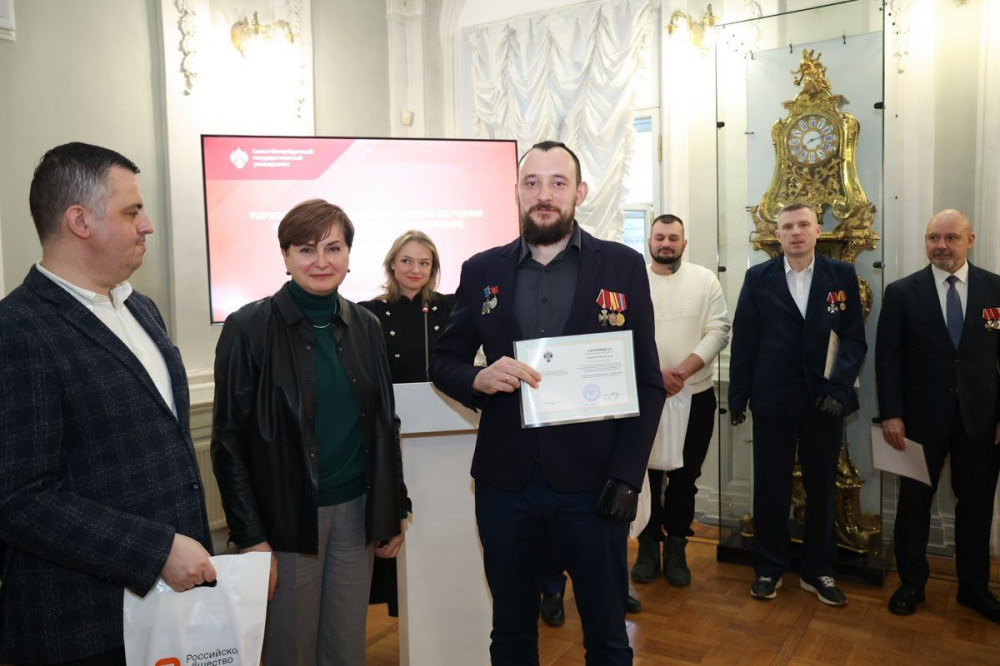 В завершение Года защитников Отечества в Санкт‑Петербургском университете состоялась торжественная церемония вручения свидетельств о прохождении программы дополнительного образования 18 участникам первого потока социально‑просветительского проекта «Мегаполис», организованного СПбГУ совместно с Российским обществом «Знание», отделением Всероссийского общественного движения «Отцы России» и региональным филиалом фонда «Защитники Отечества».