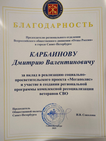 На мероприятии председатель отделения ВОД «Отцы России» в Санкт-Петербурге и Ленинградской области Дмитрий Карбаинов был отмечен Благодарностью от председателя Общественной палаты Санкт-Петербурга за вклад в реализацию проекта и участие в создании региональной программы комплексной ресоциализации ветеранов СВО.