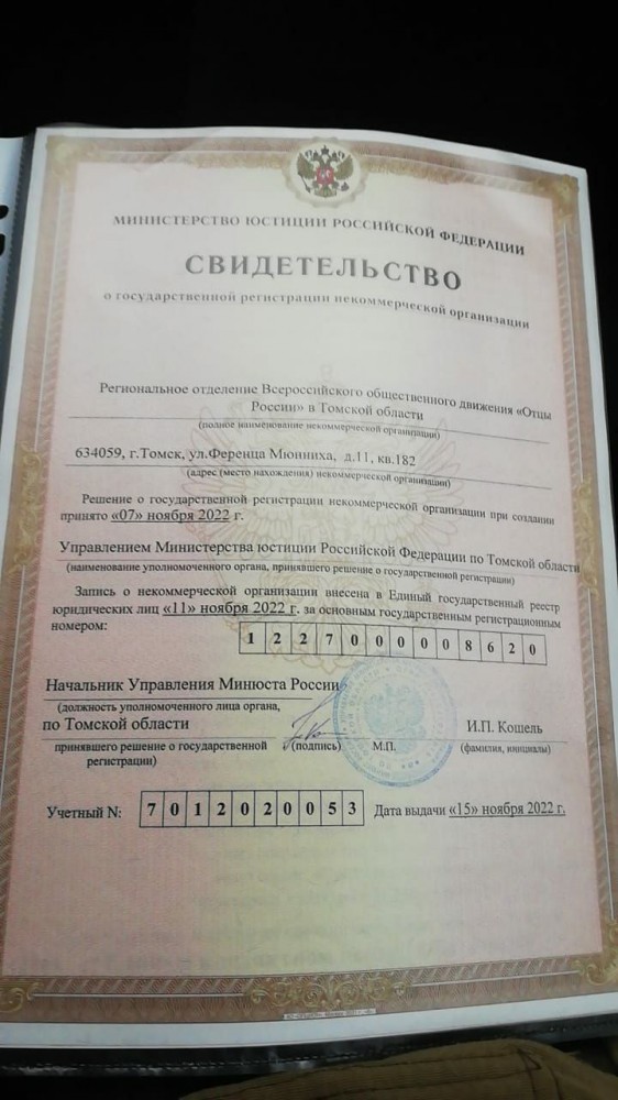 Томское и Ярославское отделения официально зарегистрированы как региональные представительства ВОД «Отцы России».