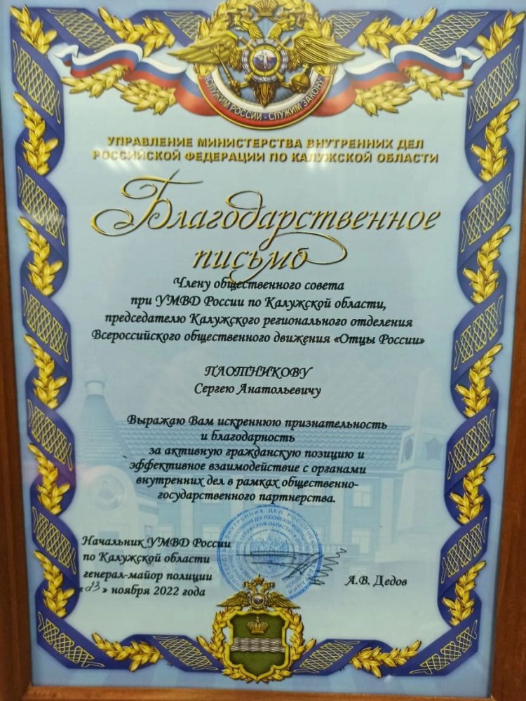 Председатель ВОД «Отцы России» в Калужской области Сергей Плотников получил Благодарственное письмо от начальника УМВД России по региону генерал-майор полиции Александра Дедова.
