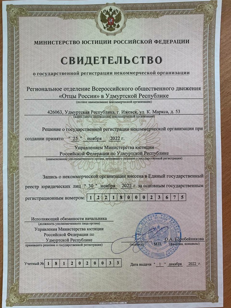 Отделение ВОД «Отцы России» в Удмуртии получило Свидетельство о регистрации в Министерстве юстиции Российской Федерации.