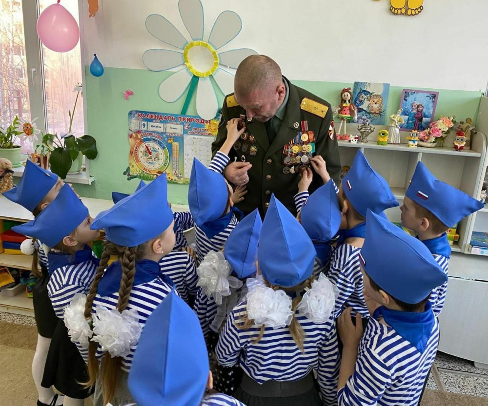 Перед малышами выступил руководитель Совета отцов в городе Арсеньев, ветеран боевых действий на Северном Кавказе, прапорщик милиции в отставке Владимир Шкода. Владимир Васильевич рассказал ребятам о своей службе в системе ВВ МВД и командировках в «горячие точки».