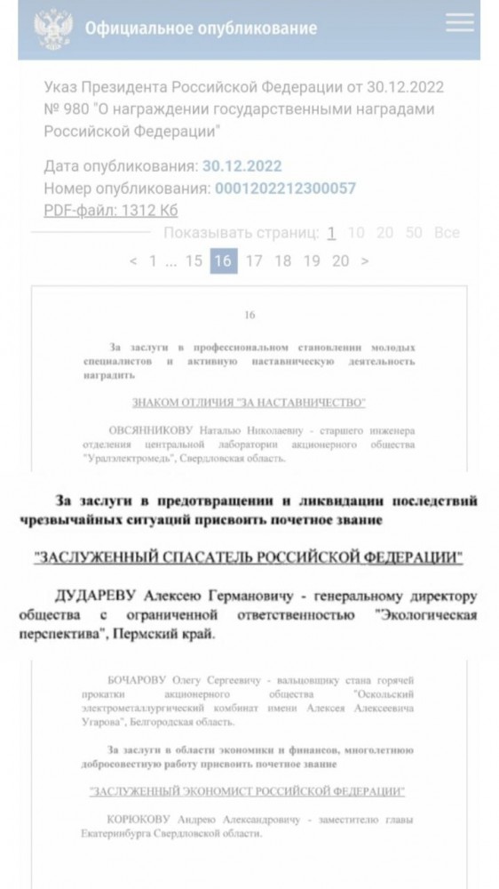 Нашему Пермскому коллеге Алексею Германовичу Дудареву за заслуги в предотвращении и ликвидации последствий чрезвычайных ситуаций присвоено почетное звание «Заслуженный спасатель Российской Федерации».
