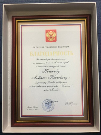 Андрей Юрьевич получил Благодарственное письмо от Президента России Владимира Путина за активную работу по защите, восстановлению прав и законных интересов детей.
