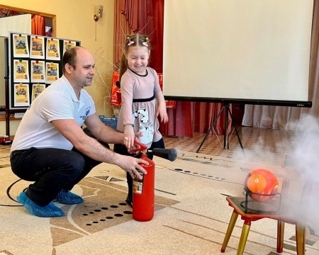 Представитель отцовского движения Дмитрий Демидов не только рассказал ребятам о шаре "АФО"и "Самоспасателе", но и наглядно продемонстрировал работу углекислотного огнетушителя.