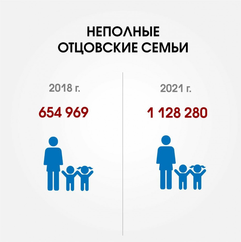 Печально, что при общем сокращении семей в России, количество неполных отцовских семей за последние годы выросло в 2 раза по данным Росстата с предыдущей сводки переписи 2010 года. Больше миллиона отцов-одиночек сегодня воспитывают в России несовершеннолетних детей.