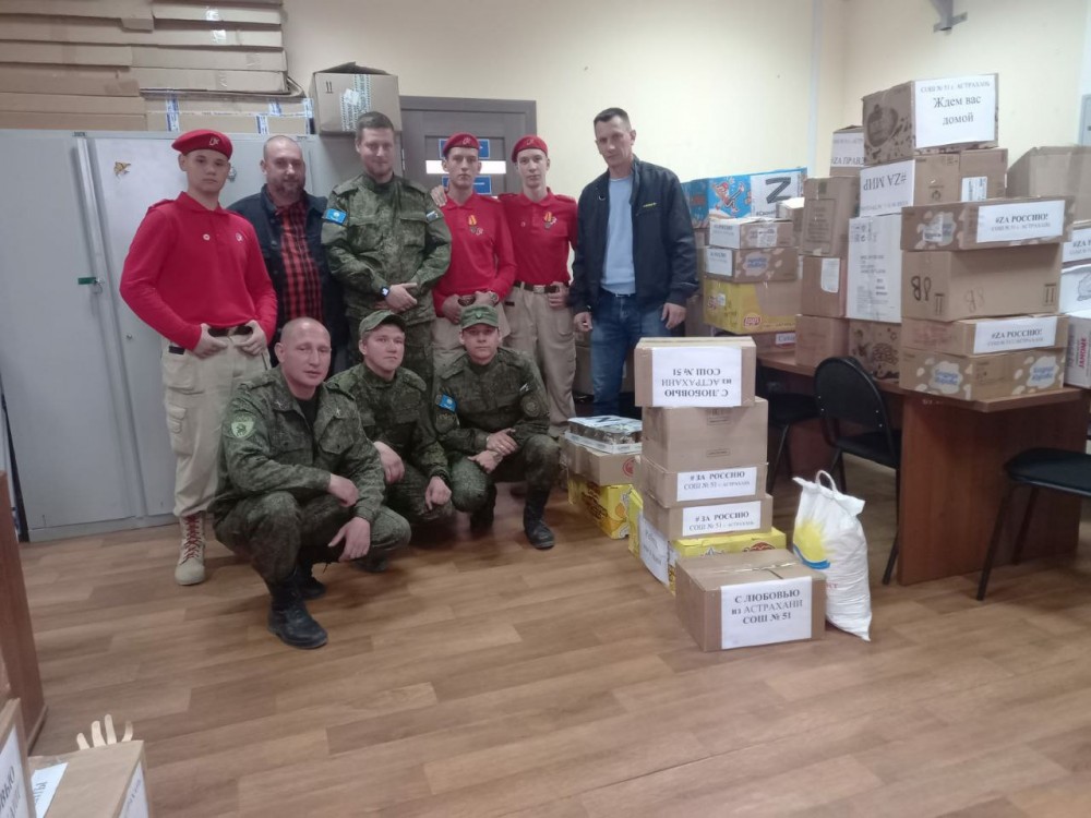 СОШ №51 города Астрахани собрала гуманитарную помощь бойцам, и сегодня юнармейцы школьного отряда «Успех», активисты ВОД «Отцы России» в регионе, участники «Школа Безопасности» и казаки АГКО отгрузили собранные посылки в штаб Правления Астраханского окружного казачьего общества «Всевеликое войско Донское» для их отправки в зону СВО.
