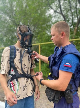 Спасатель 2-го класса МБУ города Астрахани «Аварийно-спасательной службы» Дмитрий Квасов рассказал детям об использовании дыхательного аппарата на сжатом воздухе.