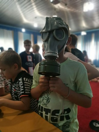 Отцы организовали для ребят небольшую выставку и продемонстрировали как выглядит граната, мина и другие взрывные элементы. Дети также примерили на себя средства индивидуальной защиты.