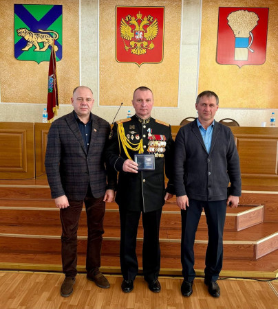 Награду отцу вручили председатель регионального отделения Всероссийского общественного движения «Отцы России» и отделения ВООВ «Боевое Братство» в Приморском крае Виктор Тарабарин и заместитель председателя Думы УГО, заслуженный тренер России по кикбоксингу Андрей Подоплелов.