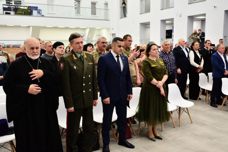 Церемонию украсила выставка «Герой нашего времени!», сделанная руками детей. Работы воспитанников Краснодарского президентского кадетского училища — более сорока произведений: портреты, пейзажи, батальные сцены, разные техники — от живописи и графики до мозаики и росписи по дереву. И всё это — не «про войну вообще», а про сегодняшних людей и сегодняшнюю веру в Победу. Проект создан совместно с Художественным музеем им. Ф.А. Коваленко.
